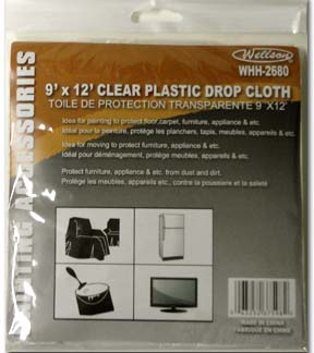 MODEL: WHH-2680 9' x 12' CLEAR PLASTIC DROP SHEET COLOUR: CLEAR PACKAGE: POLYBAG WITH HEADER PACKING: INNER: 48 PCS, MASTER: 96 PCS |