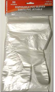 MODEL: WHH-2685 DISPOSABLE PVC GLOVES FOR PAINTING (50 PCS) COLOUR: CLEAR PACKAGE: POLYBAG WITH HEADER PACKING: INNER: 48 PCS, MASTER: 96 PCS |