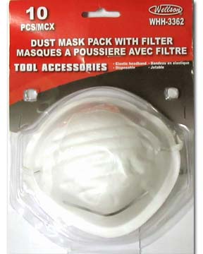 MODEL: WHH-3362 10 PCS DISPOSABLE DUST MASK COLOUR: WHITE PACKAGE: POLYBAG WITH HEADER PACKING: INNER: 48 PCS, MASTER: 96 PCS |