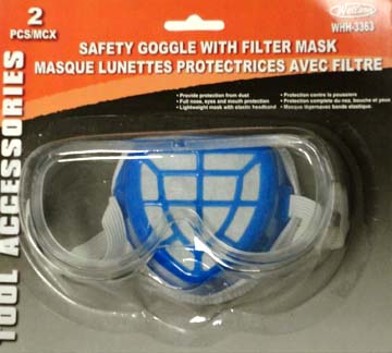 MODEL: WHH-3363 SAFETY GOOGLE WITH FILTER MASK COLOUR: BLUE PACKAGE: BLISTER PACK PACKING: INNER: 12 PCS, MASTER: 24 PCS |
